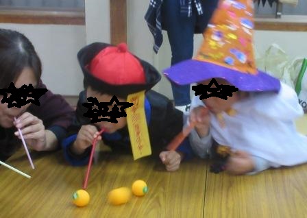 勝敗無し。さきほどのピンポン目玉をストローで拭いて、台から落とすな!というもの。