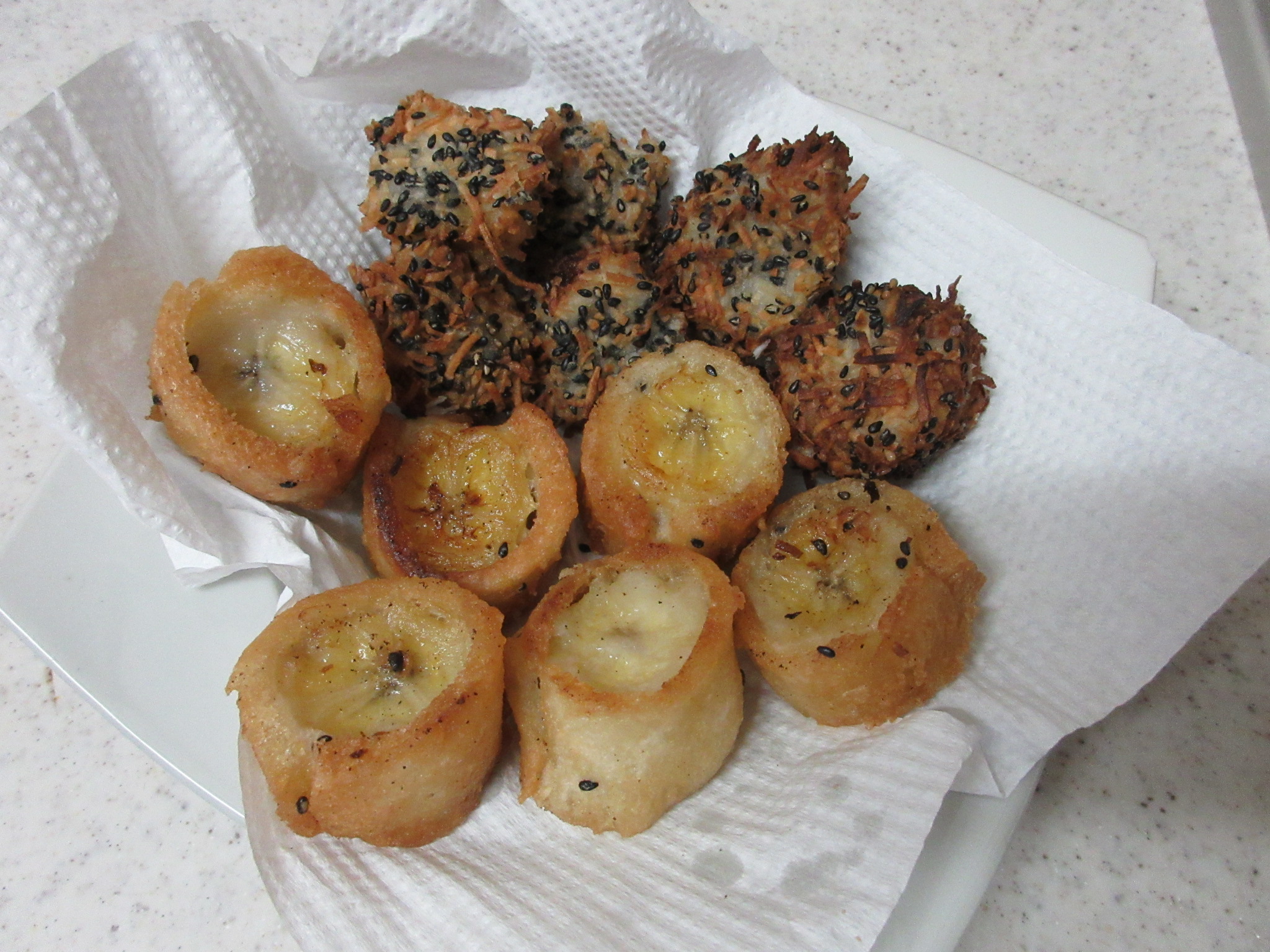 今年は、揚げバナナ。 米粉の衣に、ココナッツとゴマをまぶして揚げました。生より甘みがしっかりでます。結構おいしい。