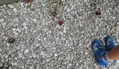2チームに分かれ、地面に黒豆を3つ立たせて並べて、20m先(!)から、別の黒豆を