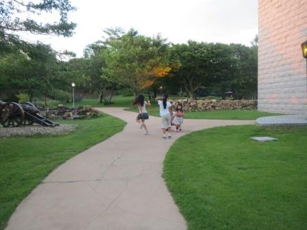 興奮した、こどもたち食事後、ダイニングホール前のお庭に出て、美しい夕日を眺めてから、なぜかソーラン節を踊りだす(笑)