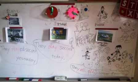 クイズ形式にしながら、play soccer, played soccer, will play soccer 一度に導入します。