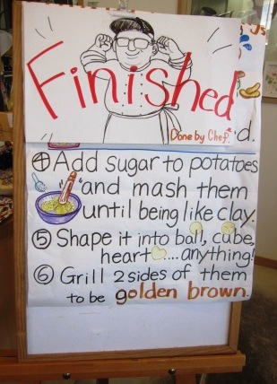 こどもたちは、砂糖とコーンスターチ加えたジャガイモを粘り気がでるまで、よくつぶした物を、好きな形にして、ホットプレートで両面焼色をつける。。。とシンプル。
