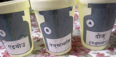 本当に入っているのは、塩水、水、砂糖水で、終わった後、子どもたちはキャアキャア味見していました。