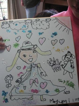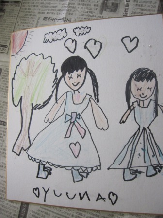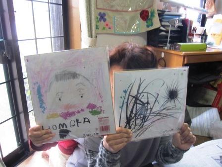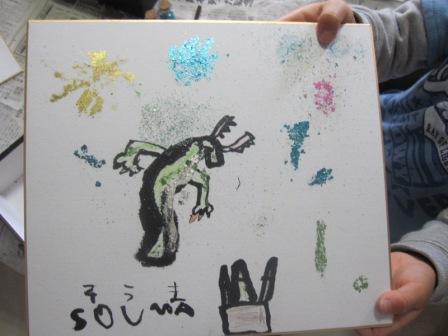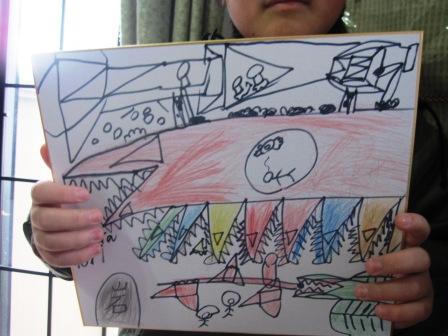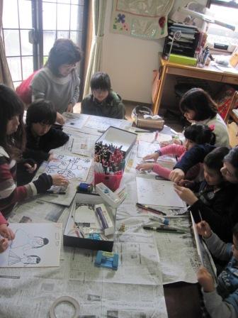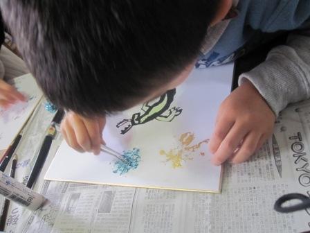 筆ペンで色紙に絵を描いて、色鉛筆で塗るところまで、各自自由にやってもらう。