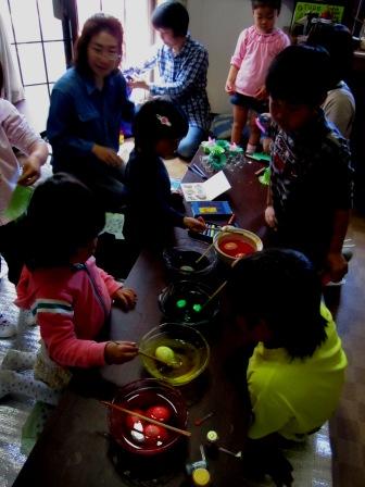 ゆで卵にクレヨンで絵や柄を描いた後に、着色料に漬け込む。