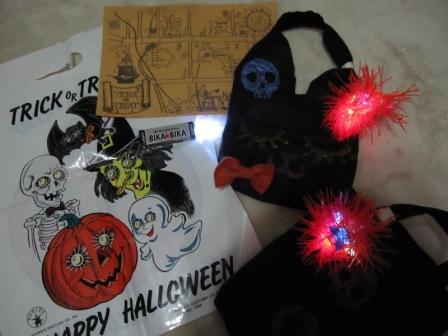 左写真)海賊地図風に描いた商店街地図、手作りミニキャンディーバッグ(男の子用、女の子用)、イラストが不気味なビニールバッグ、ガム型ライト 参加者全員に配られるセット