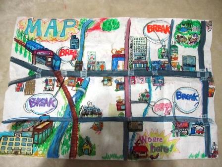 右写真)商店街の大きい地図。途中説明するときに使う。レッスンでもこれを使って生徒と事前練習していた。